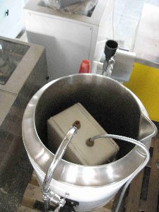 арочный котел КПЭ-60 (котел пищеварочный электрический) с рабочим объемом до 60 литров, устроен следующим образом. Внутреняя емкость изготавливается из пищевой н\ж, приваривается к наружной емкости с необходимым зазором образуя при этом пространство, которое в дальнейшем будет выполнять роль паровой рубашки. Затем конструкция закрывается теплоизоляционным материалом и декоративным ограждением. Внизу котла расположен парогенератор в котором находятся три электрических ТЭНа.При включении котла, в парогенераторе вода нагревается до кипения, при этом образовывая пар, который занимает весь объем паровой рубашки и нагревает стенки внутренней емкости отдавая ей тепло. Получая температуру от пара содержимое в котле также нагревается и закипает. С повышением температуры растет внутреннее давление в паровой рубашке, доходя до заданных параметров электроманометр отключает нагрев. При понижении давления до нижнего параметра, срабатыват механизм манометра и включает ТЭНы на нагрев.