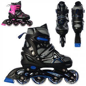 Надежные ролики для вашего ребенкаРолики Profi A 12101-S — раздвижные роликовые коньки с удобными застежками-баклями, шнуровкой, аллюминиевой рамой и колëсами ПВХ.