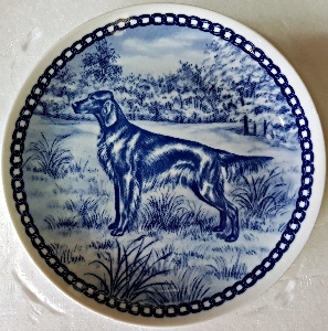 Продам датскую, кобальтовую, декоративную тарелку с собакой породы ирландский сеттер.Тарелку можно вешать на стенку имеются на обратной стороне тарелки специальные дырочки.