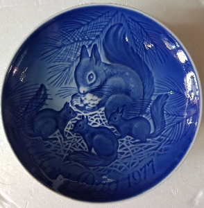 На тарелке "День матери 1977 года" есть мама-белка и три маленьких бельчонка на сосне. На лицевой стороне тарелке написано Mors Dag 1977 года.