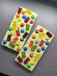 Білий бельгійський шоколад в поєднанні з желейними ведмедиками та драже m&m’s.