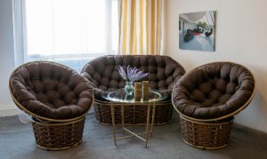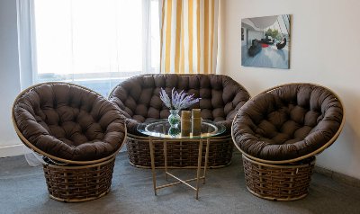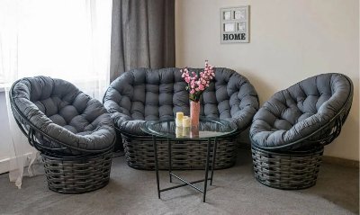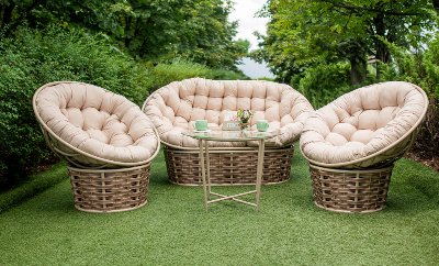 Два крісла та диван з ротанга: кожне крісло - це витвір мистецтва, що поєднує в собі комфорт і стиль. Плетені спинки та м'які подушки забезпечують зручність довгих годин відпочинку.