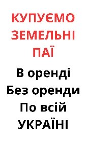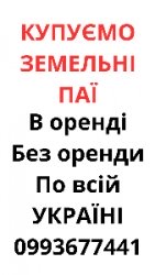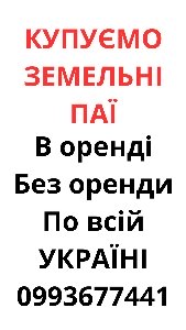 Купуємо ЗЕМЕЛЬНІ ПАЇ по всій Україні!!! - Найкраща ціна по ринку - В оренді - Без оренди - Наше оформлення - Юридичний супровід Для консультації з приводу продажу вашого паю дзвоніть за номером або пишіть у вайбер.Тел.: 0993677441