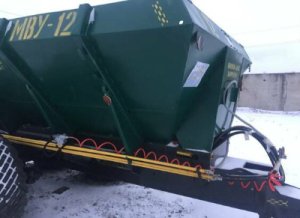 Розкидач МВУ-12 (РУМ-12) призначений для транспортування і поверхневого суцільного внесення в ґрунт мінеральних добрив, дефекату, піску,вапна,гіпсу,курпомету та ін. Бункер виготовлений з біметалу (нержавіюча сталь). Основні технічні характеристики: Маса-3600 кг. Габаритні розміри: довжина -7000 мм. ширина -2860 мм. висота -2600 мм. колія -2250 мм. Вантажопідйомність -12 т. Агрегатується з тракторами класу Т-150 та вище. Шини-22,0 / 70-20. Продуктивність га / год при внесенні гранульованих добрив щільністю 1100 кг / м2-7,8-15; вапняних матеріалів-2,4. Ширина захвату м при внесенні гранульованих добрив-14-22 м, вапняних матеріалів-10-14 м. Транспортна швидкість не більше -30 км /год .Загальні переваги розкидачів серії МВУ: