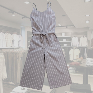 Легкий літній комбінезон з кюлотами, сірий у білу смужку в новому стані, слідів носіння немає. На поясі гумка плюс поясок, дві бічні кишені. Верхня частина ззаду на тонкій гумці, бретельки регулюються. Склад тканини зрізаний, за відчуттями бавовна з еластаном, добре тягнеться. Розмір М-L.НОГ - 45 см