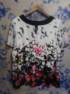ФутболкаБелого цвета , с черным воротником , с разноцветными бабочками