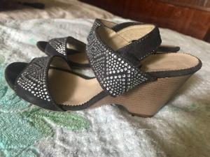 Продам:1) Босоножки женские на танкетке легкие, удобные, б/у (Twenty-two Украина). Нат.замша со стразами, цвет стальной. В прекрасном состоянии (как новые). Надевала 3 раза. (размер 36,5 - 37) 100 грн.