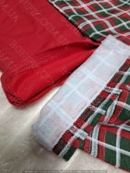 Брюки прямого крою виконані в класичну клітинку в червоно-зеленій гаммі, завдяки чому гармонічно доповнюють верх.