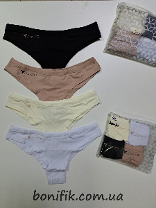 Представлені жіночі стрінги в упаковці з 4 одиниць в різних кольорах, декоровані написом "Obrana". Бавовна з якої виготовлені трусики добре проводить повітря.