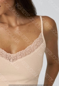 Майка виготовлена з трикотажного полотна бежевого кольору, з мереживною вставкою в зоні декольте.