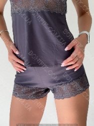 Комплект кладається з майки на тонких бретелях, має V-образний виріз декольте, широку мереживну вставку під грудьми.