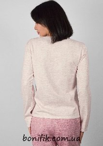 Кофта світло-рожевого (меланж) кольору з довгим рукавом і круглою горловиною, має вільний силует.