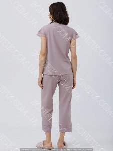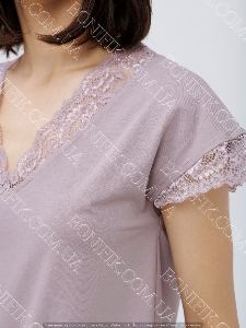Для збільшення еластичності в піжаму додана еластанова нитка. Футболка з коротким рукавом, виріз для горла V-образної форми, декорована змужкою з мереживної тканини.