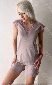Піжама міцна, не сідає навіть після багаторазового прання. Комплект складається з футболки приталенного крою, з короткими рукавами із мережива і мереживними вставками в зоні декольте.