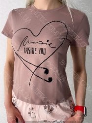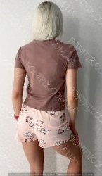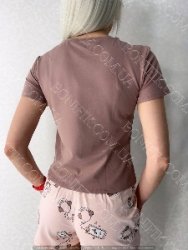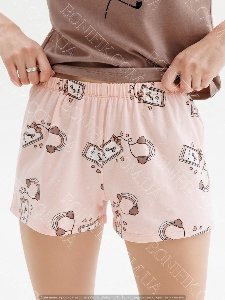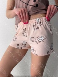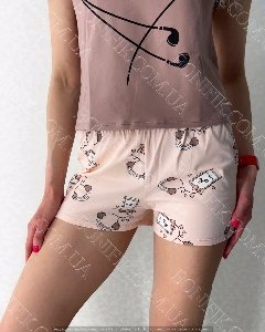Піжама складається із футболки і шорт вільного силуету. Наголос моделі піжами зроблений на привабливих малюнках на футболці та шортиках.