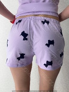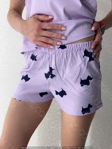 Вільні шорти з еластичною резинкою декоровані веселим принтом у виді силуетів собачок. Лавандовий колір освіжає образ і додає настрій.