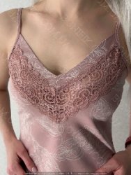 Сорочка приталеного крою, на тонких бретелях, з V-образним вирізом прикрашеним мереживною вставкою.