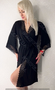 Халат чорного кольору, на поясі, має середню довжину, вільного крою.