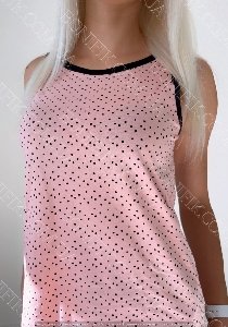 Модель на широкій бретелі, прикрашена візерунком "чорний горошок", довжина вище колін, добре підкреслює фігуру.