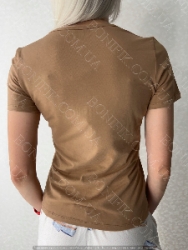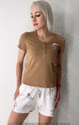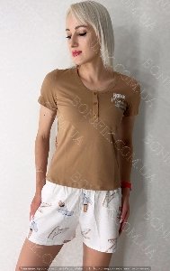 Комплект складається із короткої футболки приємного карамельного відтінку і білих шорт з оригінальним принтом.