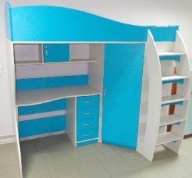 Двухэтажная кровать со столом, двухдверным шкафом и лестницей комодом, для детей старше 5-ти летСтильная кровать чердак КЧО 115 для девочек и для мальчиков. Не смотря на свои небольшие габариты, она очень многофункциональна. Необычная кровать с большим функционалом. Стол имеет вместо трех шухляд - четыре. Он является отдельной конструкцией и его можно ставить так как удобно будет ребенку. Над столом две открытых полки и одна закрытая. В угловом шкафу 3 полки и штанга для плечиков.