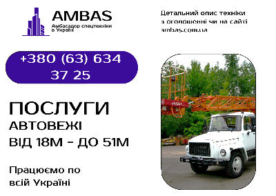 Вітаємо в АМБАС. Ми готові допомогти з вашою роботою всього в один клік чи дзвінок. Все для того, щоб ви зекономили свій час.Готові надати вам послуги з оренди автовежі (ліктьова, телескопічна, комбінована), також, на ваш запит надаємо іншу в оренду техніку через наших партнерів, яка потрібна для вашої роботи.