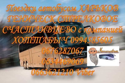 Компания Хоттабыч оказываетРегулярные пассажирские перевозки по маршруту Харьков Геническ Счастливцево Стрелковое . Автобус следует через Днепр, Запорожье, Мелитополь.