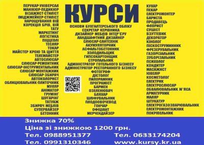 Курси перукар, манікюр, кухар, зварник, електрик, слюсар, токар, тесляр, візажіст, нарощування вій, тату, маркетинг, логістика, корекція брів вій, піццеола, крою та шиття, телемайстер, автослюсар, слюсар ремонтник, слюсар інструментальник, слюсар монтажник, слюсар збирач , автоколоріст, муляр, аніматор, грумінг, шугарінг, татуаж, зборщик меблів, плиточник, бухгалтер, секретар, слюсар сантехнік, акумуляторникк, асфальтобетонщик, холодильщик, гипсокортонщик, стропальник, фотограф, діетолог, пилорамник, прогаміст, бармен, озеленювач, бляхар, шліфувальщік, плодоовочевод, офіціант, мерчендайзер, охоронець, пекар, барист, продавець, флористика, сушіст, взуттєвик, обвальщик м\'яса, декоратор, кінолог, пескострумнник, фрезерувальник, газорізальник, зуборізальник, психолгія, кондитер, масажист, ювелір, косметол, арматурник, маляр, штукатур, електромонтажник, покрівельник та інші. Знижка 70% на навчання. www.kursy.kr.uaДополнительная информация на сайте kursy.kr.ua