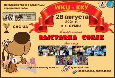 28 августа 2021 года в г.Сумы в парке им. Кожедуба состоится ВСЕУКРАИНСКАЯ ВЫСТАВКА СОБАК всех пород «СУМЫ-2021» с присуждением титула Кандидат в Чемпионы Украины).Организатор: Сумской областной клуб собаководства Кинологического Клуба Украины (WKU - Мировой Кинологический Союз (World Kennel Union).