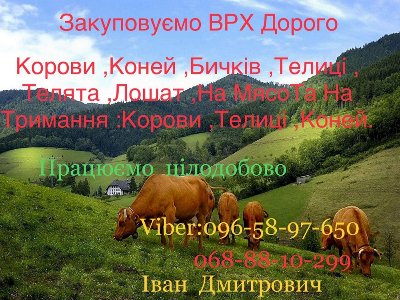 закуповуємо Врх: Корови Коні Бички Телиці Телята Лошата На м‘ясо Та На Тримання Працюємо цілодовоПопулярные объявления
