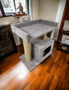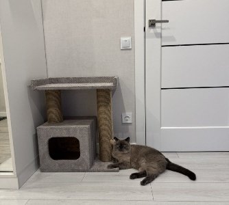 Такой домик - очень понравится Вашим котикам, а особенно если у Вас их двое. Эта модель самая популярная среди заказчиков у которых не одно животное. Такой комплекс занимает немного места, очень компактный и выглядит очень круто, особенно в этом цвете, ткань как бархат. Так как это мебельный материал он отлично впишется в Ваш интерьер. Очень Важный плюс, что сверху домика есть лежак есть лежак, для отдыха и наблюдения за домочадцами)