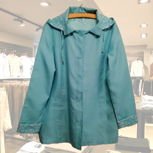 Легка куртка-вітровка бірюзового кольору з білими метеликами на рукавах манжетах і внутрішній стороні капюшона. Куртка подовжена, на ґудзиках, прямого крою, є кишені, підкладка в тон, капюшон знімається (ґудзики).Стан нової речі.