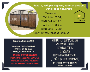Нас можно найти по таким тегам: Акабуд Кривой Рог еврозабор, бетонные заборы, ЖБИ кольца, ЖБИ днища, бетонные изделия, навесы с ковкой, навесы без ковки, навесы из поликарбоната, навесы из профнастила, ворота откатные, ворота распашные, калитки, металлические решетки, козырьки из поликарбоната, козырьки металлические, сварные заборы, кованые заборы, заборы на заказ, металлоконструкции, производство заборов, установка заборов, ограждения, кованые изделия, строительство навесов