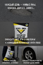 Холодний асфальт "ANTI-ЯМА" - готова суміш для використання для ремонту дорожнього покриття. Ремонт можна робити за будь-якої погоди за температури від -25 ℃ до +50 ℃ навіть за наявності опадів. Відразу після укладання холодного асфальту "ANTI-ЯМА" по ньому може рухатися автотранспорт, при цьому відремонтована ділянка прослужить не менше, ніж основне покриття.