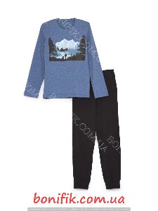 Комплект піжами складається з напівприталенної кофти та штанів. Піжама виготовлена из м'якої кольорової бавовни з додаванням малюнку гірського пейзажу.