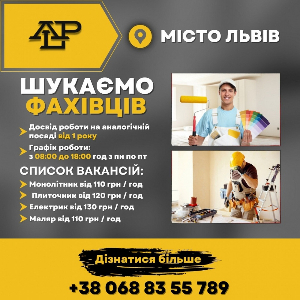 Шукаєте роботу у ремонтно-будівельній компанії? Тоді наша оголошення саме для вас! Ми - компанія "alp" - шукаємо спеціалістів у ремонтні роботи житлових приміщень. Запрошуємо майстрів по ремонту монолітних конструкцій, плитки, електрики, малярів та виконробів зі сантехніки. Ми пропонуємо цікаву роботу великій команді з можливістю професійного зростання. Для отримання додаткової інформації звертайтеся за телефоном +380 68 835 57 89 Олена. До нашої команди приєднайтесь вже заразПопулярные объявления