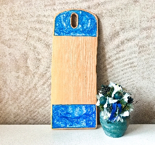 Совершенно новая доска в различной цветовой гамме. Главная задача в данном проекте это совмещение таких параметров, как габариты и внешний вид. Причем для нарезки и отбивание мяса можно использовать не только лицевую, но и заднею сторону, где нет смолы вообще. Данная доска — это отличный внешний вид и надежность. Совмещение стандартного и перламутрового цвета это нечто, с учетом возможности подбора под кухню — это идеальное решение. Мы решили пойти дальше, чем наши конкуренты и уделили особое внимание мелочам. Во-первых, наши доски — это цельный элемент ясеня, а не какая-нибудь клееная сосна. Во –вторых: скруглены по всему периметру, что улучшает эстетический вид. Заливка сделана не насквозь поскольку это не надежно в плане использования. Изделие уже покрыто специальным маслом и готово к использованию. Отправка доски осуществляется в нестандартной коробке, с наполнителем идеален вариант, если вы покупаете часы на подарок. Забрали на почте – подарили. Теперь не нужно отдельно покупать подарок, потом стоять в очередях, для его упаковки! Можем изготовить на заказ любой цвет, форма, размеры.Габариты Изделия: