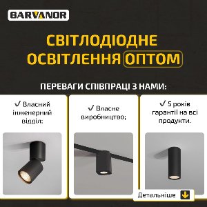 Українська компанія-виробник сучасного освітлення та трекових систем “Barvanor” запрошує до взаємовигідної співпраці представників торгівлі, забудовників, дизайнерів світла, проектувальників та інших спеціалістів освітлення. Наш бренд пропонує широкий асортимент освітлювального обладнання власного виробництва, серед якого:Магнітні треки;