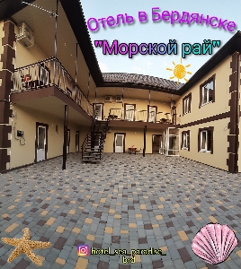 На берегу Азовского моря в курортном городе Бердянск расположился шикарный новый отель 2020 г. "Морской рай", который предлагает для отдыха комфортные условия европейского уровня. Расположение отеля даст вам преимущества удобного отдыха, поскольку в близи него находиться: три пляжа 1, 2 и 3-тий пляжи, дойти до которых можно всего за 5 мин., так же рядом центр города, где проходят все мероприятия и развлечения. В 100м. от отеля имеются: кафе, рестораны, луна-парк, супермаркеты, рынок и все прочее. Состоит отель из просторных и светлых 2-х местных номеров класса Люкс. Все номера оснащены изысканном современной мебелью и высокотехнологичными средствами коммуникаций. В каждом номере присутствует атмосфера домашнего комфорта и удобства, благодаря чему гости полностью окунаются в мир спокойствия и гармонии, этом забывая о проблемах и заботах. Номера обустроены: кондиционером, холодильником, телевизором с плоским экраном Т-2, Wi-Fi, собственным санузлом . На территории отеля есть просторная общая кухня со всеми принадлежностями , для самостоятельного приготовления пищи, а так же имеется мангал. Возле отеля предоставляется место для парковки автомобиля. В 10 мин. на авто от нашего отеля находиться: Зоопарк «Сафари» , аквапарк и дельфинарий. В отеле "Морской рай" маленьким и юным отдыхающим будет весело проводить время , большой двор и много игрушек не дадут им скучать.Украина, г.Бердянск ул. Морская 44