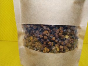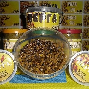 Перга- это цветочная пыльца, собранная пчелами, утрамбованая ими в соты и залитая медом. Без доступа воздуха и повышенной влажности в гнезде, под воздействием ферментов слюны и меда, пыльца подвергается ферментативному брожению с образованием молочной кислоты, которая в дальнейшем является ее консервантом и препятствует развитию бактерий и плесневых грибов. По вкусу перга напоминает ржаной хлеб смешанный с медом, поэтому ее часто называют пчелиным хлебом.Перга включает в свой состав аминокислоты, различные витамины и ферменты, которые обладают антимикробными свойствами и имеют высокую биологическую ценность.