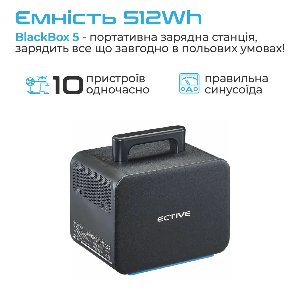 512Wh ємності, 500W сумарної потужності, 2 розетки на 230V, EC5 для запуску двигуна, 2 роз'єми DC5521 та USB-C/USB-A порти відкривають безмежні можливості підключення електроприладів на природі, рибалці чи полюванні.ECTIVE BlackBox 5 - портативна станція з правильною синусоїдою, заведе автомобіль і зарядить все що завгодно в польових умовах!