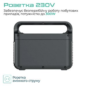 Розетка змінного струму: З вбудованим перетворювачем напруги на 230V, забезпечує безперебійну роботу побутових приладів, потужністю до 300W.