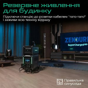 4608Wh ємності, 3800W сумарної потужності, функція ДБЖ, 4 розетки, 2 роз'єми DC5521 та USB-A/USB-C порти відкривають безмежні можливості підключення електроприладів вдома або на природі.Портативна зарядна станція з правильною синусоїдою Zendure SuperBase V4600 - готове рішення для живлення електроенергією всього будинку!
