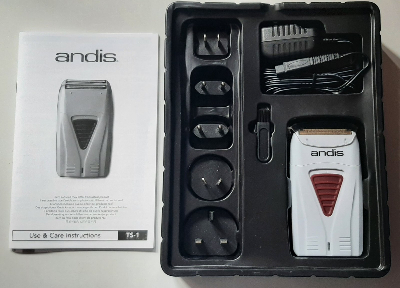 Комплектация: Бритва Andis Shaver Pro Foil TS-1, блок питания, щетка для очистки, защитный колпак и сопроводительная документация.